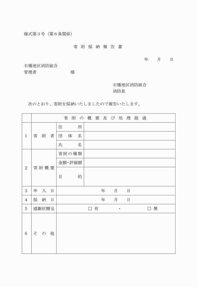 第8条 総務課長は、寄附採納が決定したものの収納手続き等については、石橋地区消防組合財務規則(平成6年石橋地区消防組合規則第7号)の例により処理するものとする。